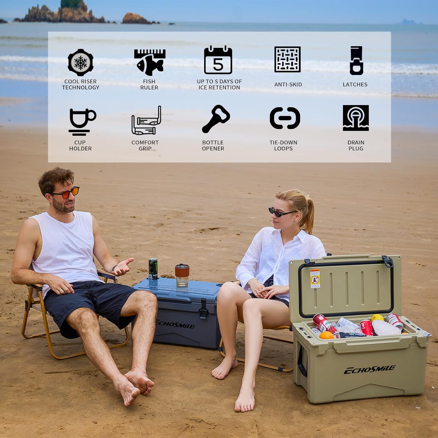Designed using advanced Rotomolding Technology. With a seamless cooler body and a silicone sealing ring, our coolers deliver cold drinks all weekend with one ice fill, allowing for up to 5 days of ice retention. This means your drinks and perishables stay refreshingly cold for longer, even in warm weather conditions. But it's not just about keeping things cold; it's also about functionality and convenience. Our cooler boasts a range of features designed to make your life easier, including an ergonomic handle and wheels on larger sizes for easy moving, top quality lock-down latches for secure sealing, a lid with a built-in bottle opener and a practical. below bottom surface drain plug for complete water drainage. Whether you're a seasoned Travel Ball Parent, or simply someone who enjoys spending time in the great outdoors, the EchoSmile Cooler is the perfect companion for all your cooling needs. EchoSmile Coolers deliver Top Quality at a Refreshing Price!
