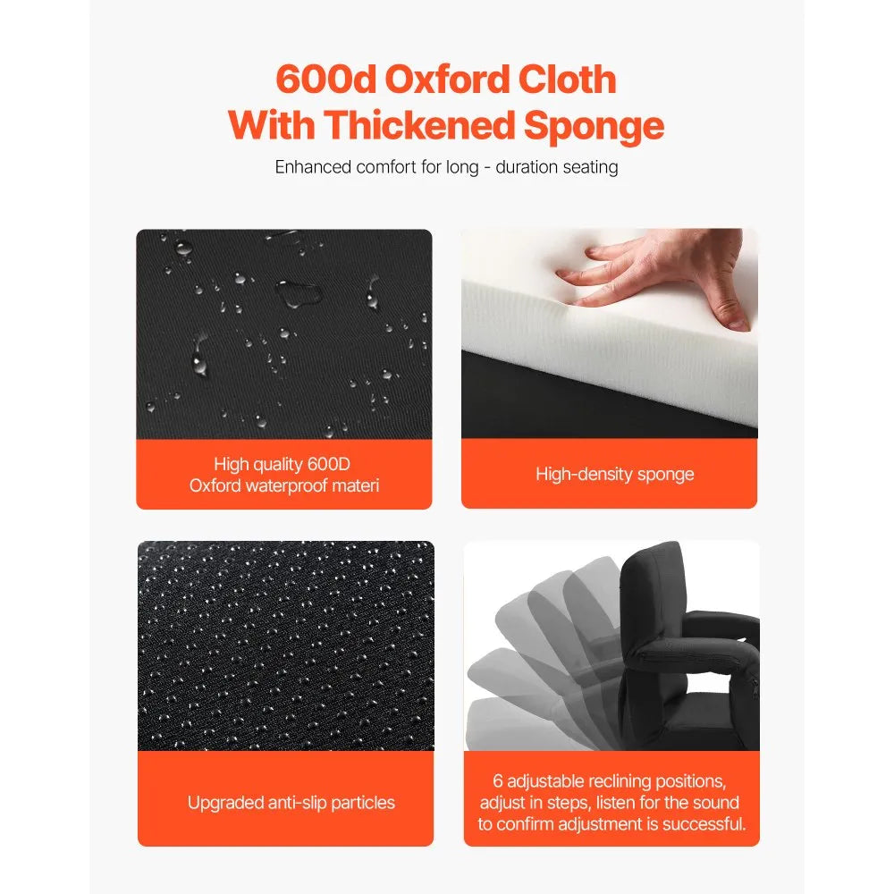 - 6-Position Adjustable Backrest: The folding stadium seat offers 6 adjustable reclining angles, including 90°, 105°, 130°, 145°, 160°, and 180°. Adjust the seat by pushing it past the foremost position, and then push it back to get a flat position. This adjustment provides ample support, maintaining a comfortable posture even during hours-long events.